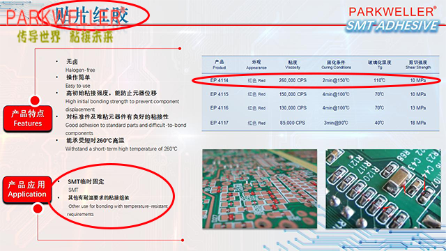 為確保客戶能順利使用SMT貼片紅膠,帕克威樂新材料建立了完善的“售前技術(shù)咨詢+售后問題響應(yīng)”服務(wù)保障體系,為客戶提供全流程支持,解決客戶在SMT貼片紅膠選擇、使用過程中的顧慮。在售前階段,針對客戶不明確自身需求的情況,帕克威樂的技術(shù)團(tuán)隊(duì)會(huì)先了解客戶的SMT生產(chǎn)工藝(如波峰焊或回流焊)、元器件類型、PCB基板材質(zhì)、環(huán)保要求等信息,然后為客戶推薦適配的SMT貼片紅膠型號(如EP 4114),并提供詳細(xì)的產(chǎn)品技術(shù)文檔,包括性能參數(shù)、使用方法、固化工藝建議等。若客戶有特殊需求,技術(shù)團(tuán)隊(duì)還會(huì)提供樣品進(jìn)行測試,并指導(dǎo)客戶進(jìn)行試產(chǎn),確保產(chǎn)品符合客戶預(yù)期。在售后階段,若客戶在使用SMT貼片紅膠過程中遇到問題(如涂膠不均、固化不完全、粘接強(qiáng)度不足等),可通過電話、郵件等方式聯(lián)系帕克威樂的售后團(tuán)隊(duì),團(tuán)隊(duì)會(huì)在24小時(shí)內(nèi)響應(yīng),提供解決方案;對于復(fù)雜問題,技術(shù)人員還可上門服務(wù),現(xiàn)場排查問題原因,如調(diào)整點(diǎn)膠機(jī)參數(shù)、優(yōu)化固化爐溫度曲線等,幫助客戶快速解決問題,減少生產(chǎn)線停機(jī)時(shí)間。此外,帕克威樂還會(huì)定期回訪客戶,了解SMT貼片紅膠的使用情況,收集客戶反饋,持續(xù)優(yōu)化產(chǎn)品和服務(wù),確保客戶在整個(gè)合作周期內(nèi)都能獲得可靠的支持,提升客戶使用體驗(yàn)。汽車中控PCB生產(chǎn)中,帕克威樂SMT貼片紅膠適配回流焊高溫工藝。浙江亞洲SMT貼片紅膠技術(shù)支持